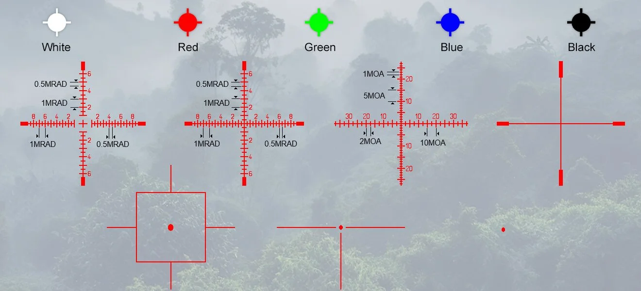 Personalize your aiming preferences. Select from 7 different reticle patterns, ranging from MOA (1st and 2nd) to MIL (3rd to 7th).