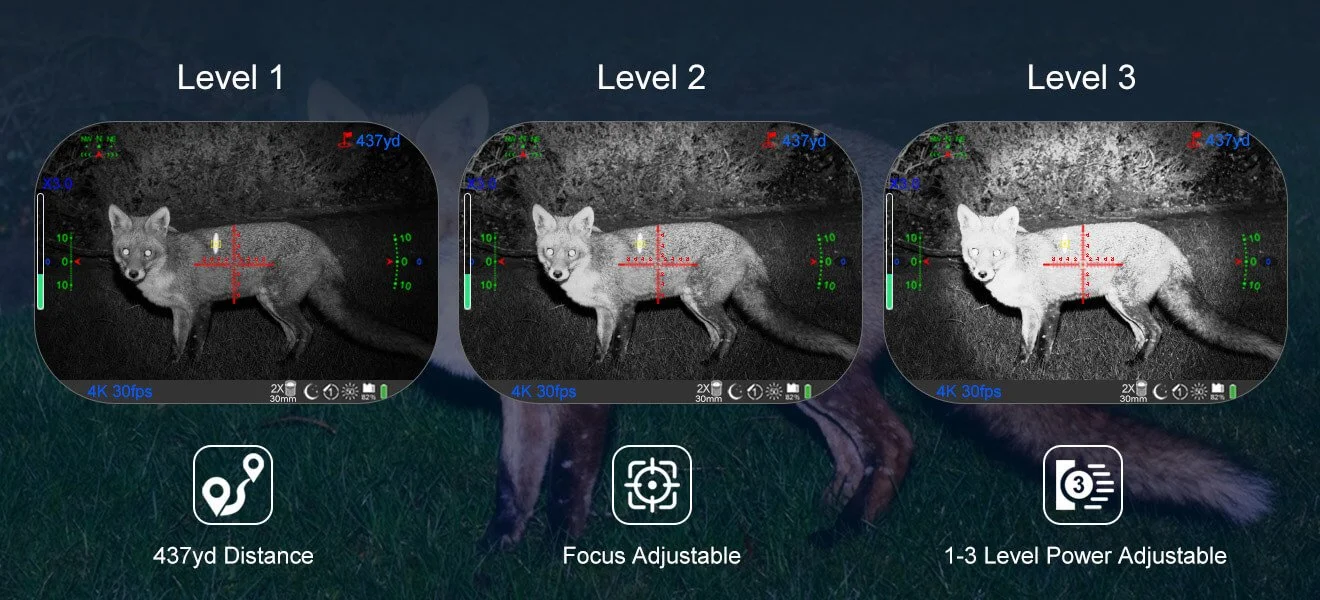 Explore the darkness with confidence. The NV500 boasts an impressive night vision range of up to 437 yards (400m). Its powerful 8W infrared illuminator offers adjustable power levels (1-3) and precise focus capability.