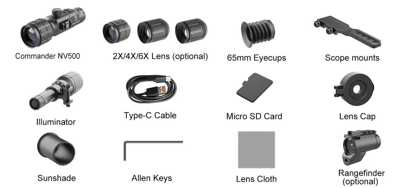 1 x Commander NV500 (main body), 30mm/50mm/70mm Lens (optional), 1 x Scope Mount, 1 x SD Card, 1 x Eyecups, 1 x Micro HDMI Cable (optional), 1 x Type C Cable, 1 x Sunshade, 1 x Lens Cap, 1 x Allen Keys, 1 x Lens Tissue, 1 x Illuminator, 1 x Rangefinder (optional)
